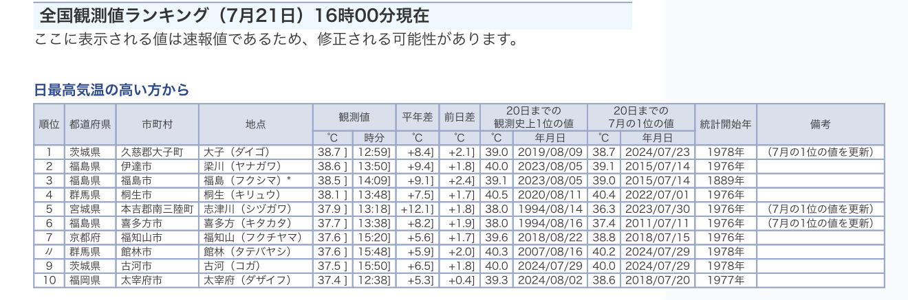 •Se rompieron varios récords para el mes de julio, especialmente en ciudades del norte y este de Japón, como Daigo (Ibaraki), Yanagawa (Fukushima) y Shibukawa (Gunma).