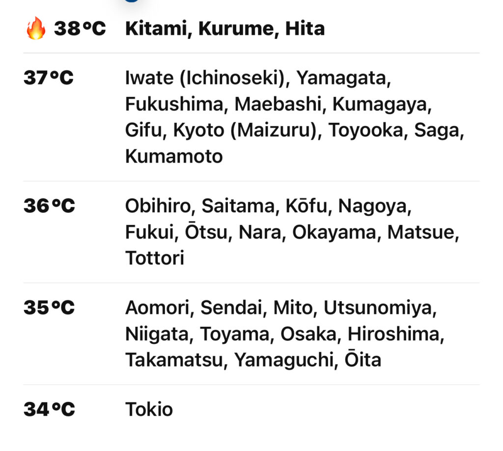 Desde la mañana, la masa de aire caliente ha dominado Japón. En lugares como Kitami (Hokkaido) o Kurume (Fukuoka), el termómetro apunta hasta los 38 °C, igualando o incluso superando la temperatura corporal. En muchas zonas se prevén entre 35 y 37 °C, incluyendo grandes ciudades como Sendai, Nagoya, Osaka, Hiroshima y Kumamoto, lo que ha activado alertas máximas por riesgo de golpe de calor (熱中症).