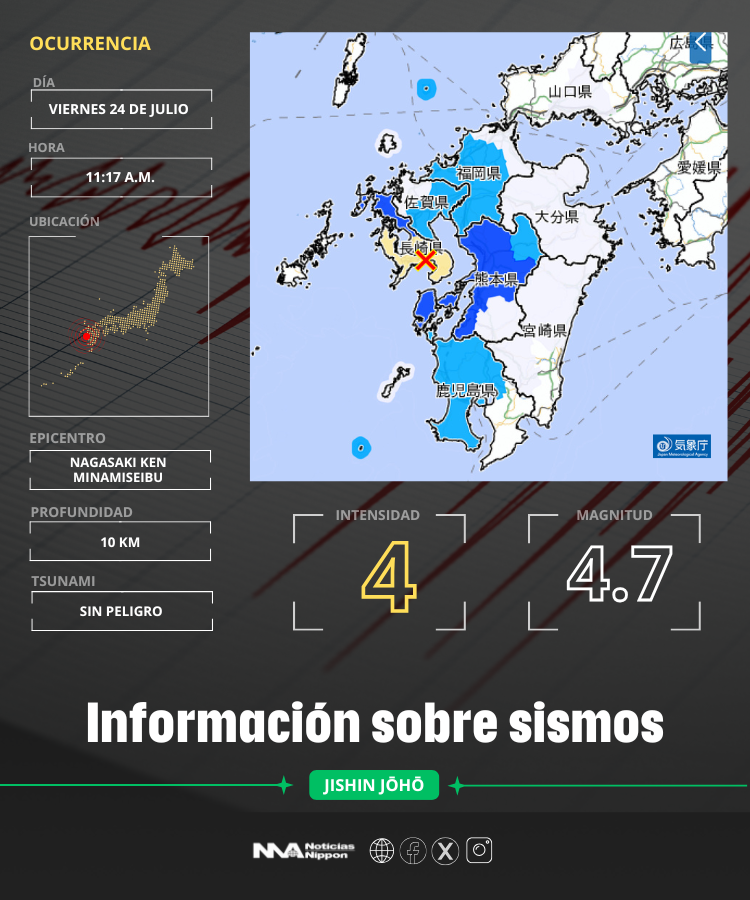 Este viernes, poco después de las 11:17 a. m., un fuerte sismo sorprendió a los habitantes de la región suroeste de la prefectura de Nagasaki, con una intensidad máxima de shindo 4 (equivalente a un nivel fuerte pero no destructivo en la escala sísmica japonesa).