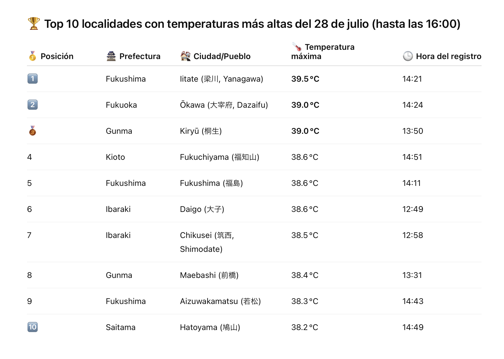 Hoy fue otro día marcado por un calor abrasador en Japón, con temperaturas que rozan o superan los 39°C en varias localidades del país. El ranking nacional de temperaturas máximas del día refleja cómo la ola de calor de finales de julio de 2025 está rompiendo récords mensuales e históricos en múltiples puntos de observación.