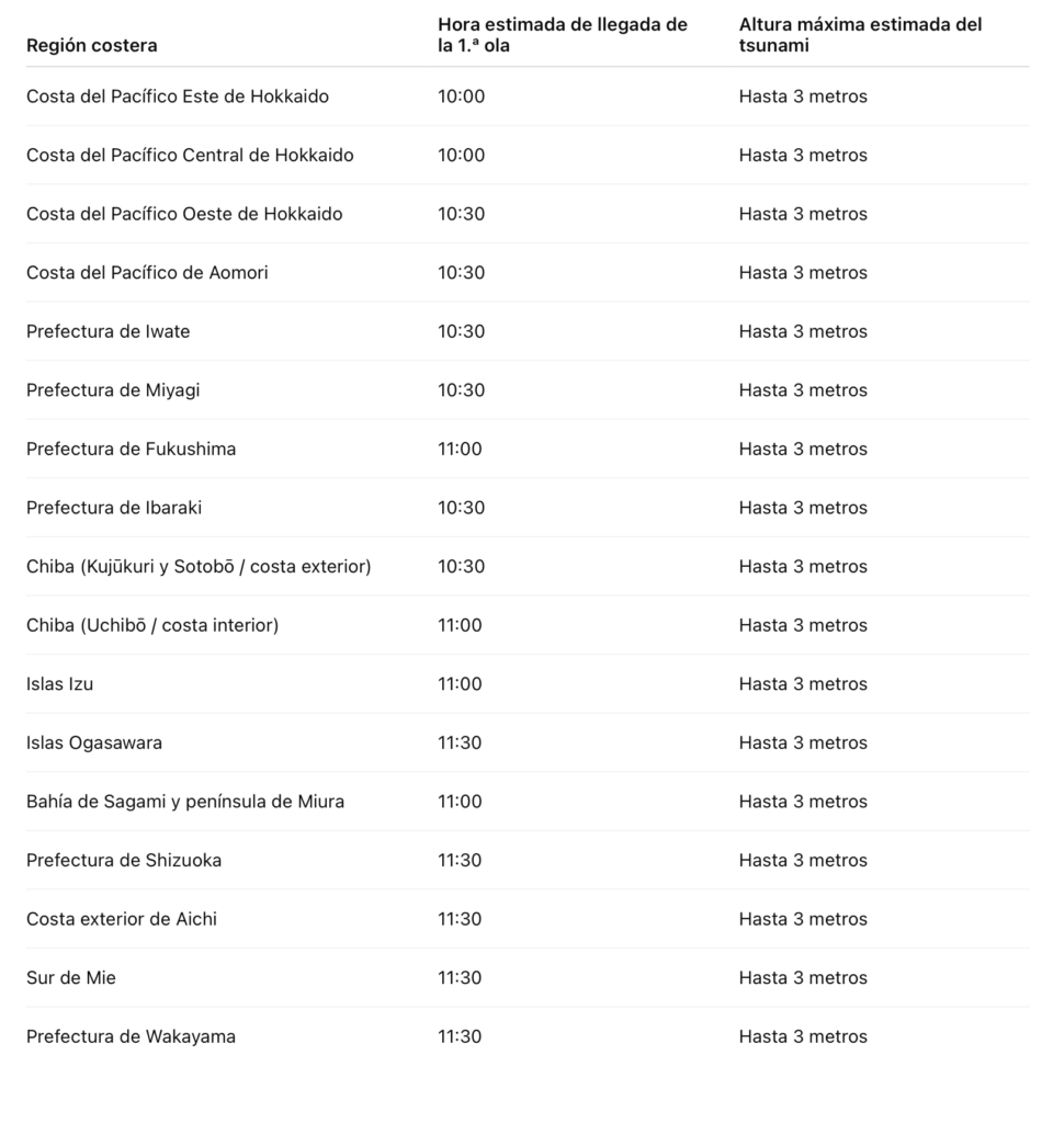 🌊 Zonas con alerta de tsunami (altura esperada de hasta 3 metros):