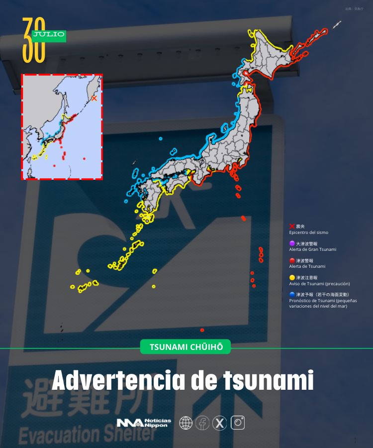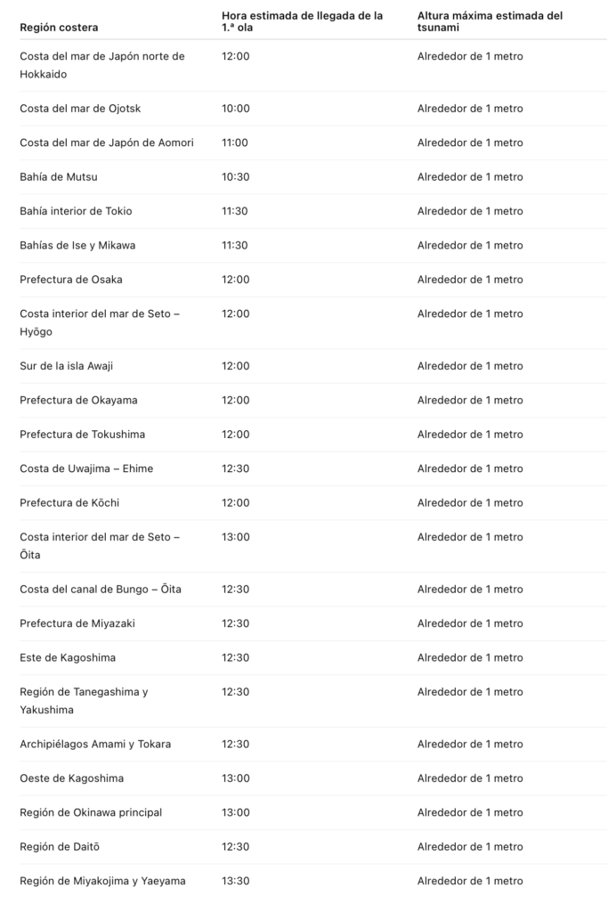 En respuesta, la Agencia Meteorológica de Japón (JMA) ha emitido a las 09:40 de la mañana una alerta máxima de tsunami para amplias zonas costeras del país, alertando sobre olas que podrían alcanzar hasta 3 metros de altura.