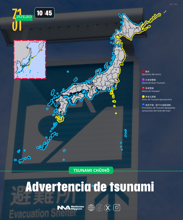 La Agencia Meteorológica de Japón (気象庁) ha levantado parcialmente la alerta de tsunami emitida tras el potente sismo de magnitud 8.7 registrado cerca de la península de Kamchatka, Rusia.