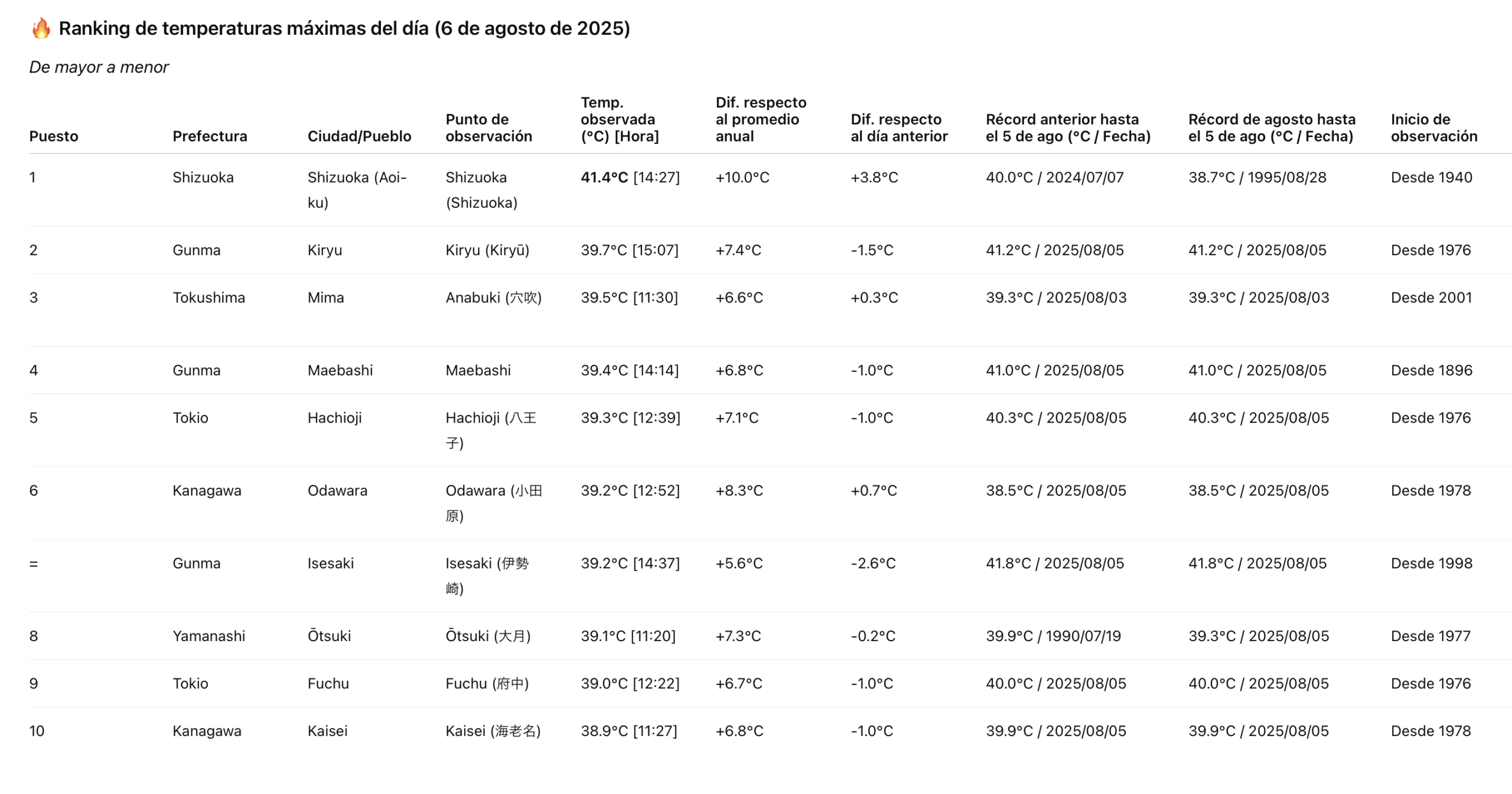 La ciudad de Shizuoka alcanzó un escalofriante récord de 41.4 °C, el segundo registro más alto en la historia meteorológica del país, solo superado por los 41.8 °C de ayer en Isesaki, prefectura de Gunma.