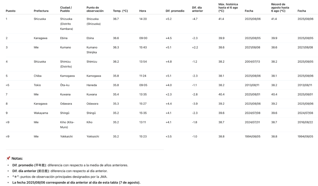 | Shizuoka | 36.7 °C | ¡La más alta de Japón hoy! |