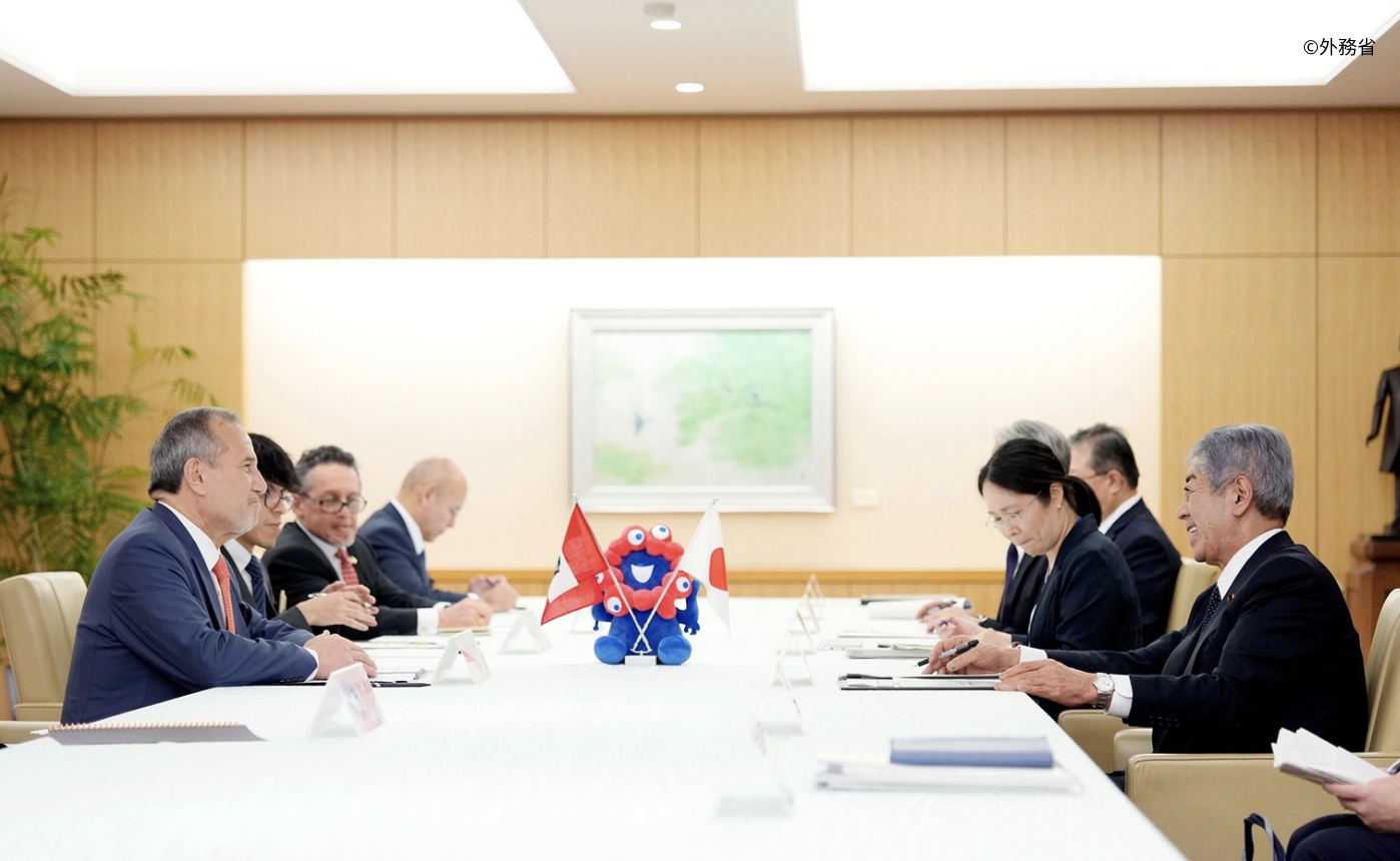 Hoy viernes por la tarde en un gesto que reafirma los lazos de cercanía y confianza mutua, el ministro de Asuntos Exteriores de Japón, Iwaya Takeshi, recibió en reunión oficial a su par peruano, Elmer Schialer, quien se encuentra de visita en Japón acompañando a la presidenta Dina Boluarte en el marco de la Expo 2025 Osaka-Kansai.