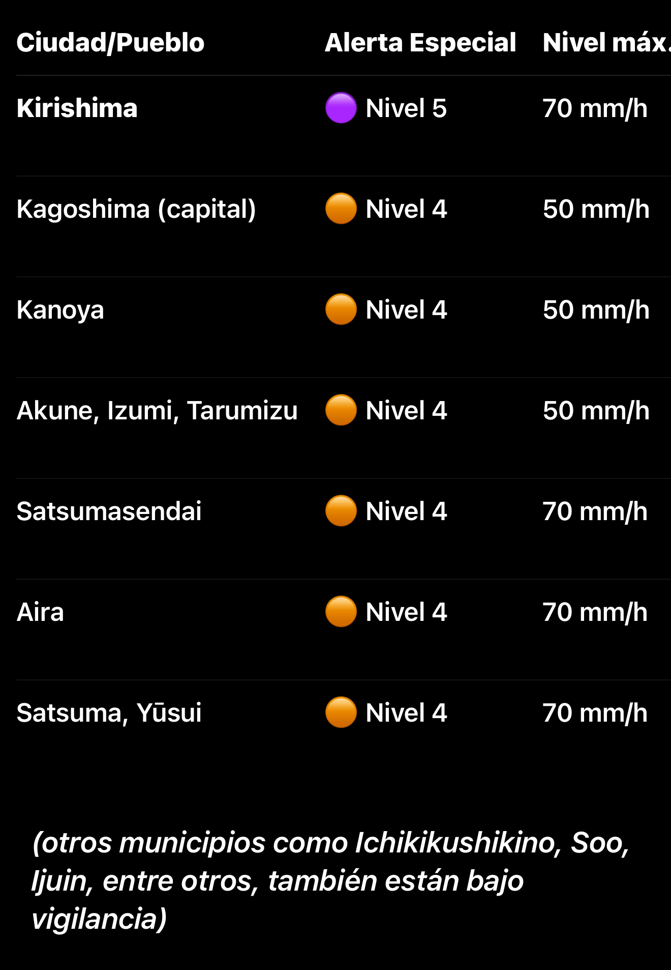 - Kirishima City (霧島市): Emitida una *orden de “emergencia de seguridad inmediata” (緊急安全確保) para toda la ciudad.