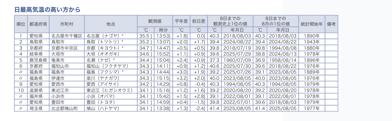 Hoy, 9 de agosto, el ranking de temperaturas máximas en Japón estuvo encabezado por Nagoya (Aichi), que alcanzó 35.5 °C a las 13:53, superando en 1.8 °C su promedio histórico y quedando 4.8 °C por debajo de su récord absoluto de 40.3 °C registrado el 3 de agosto de 2018.
