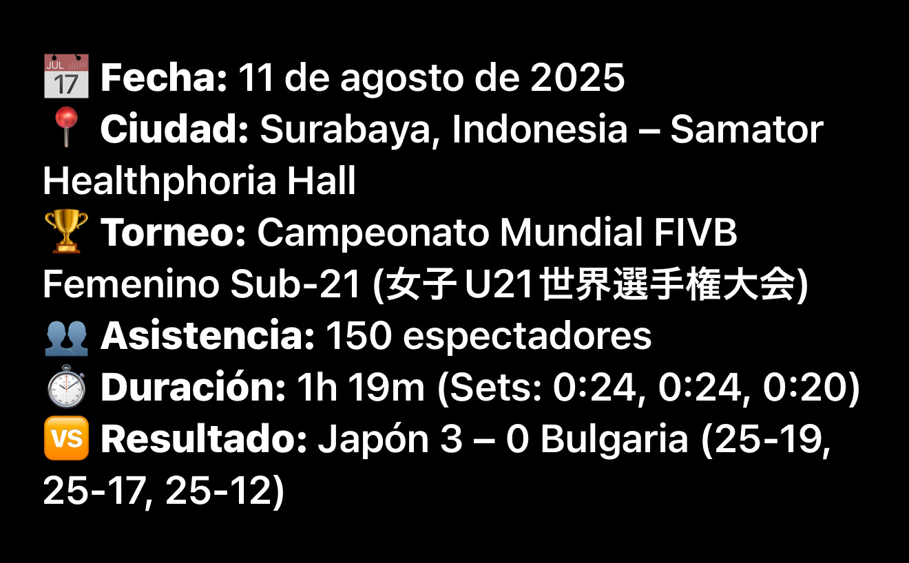 - 3º set (25-12): Con Bulgaria ya desgastada, Japón desplegó su repertorio: ataques por todas las zonas, defensa férrea y un cierre contundente con un ace.
