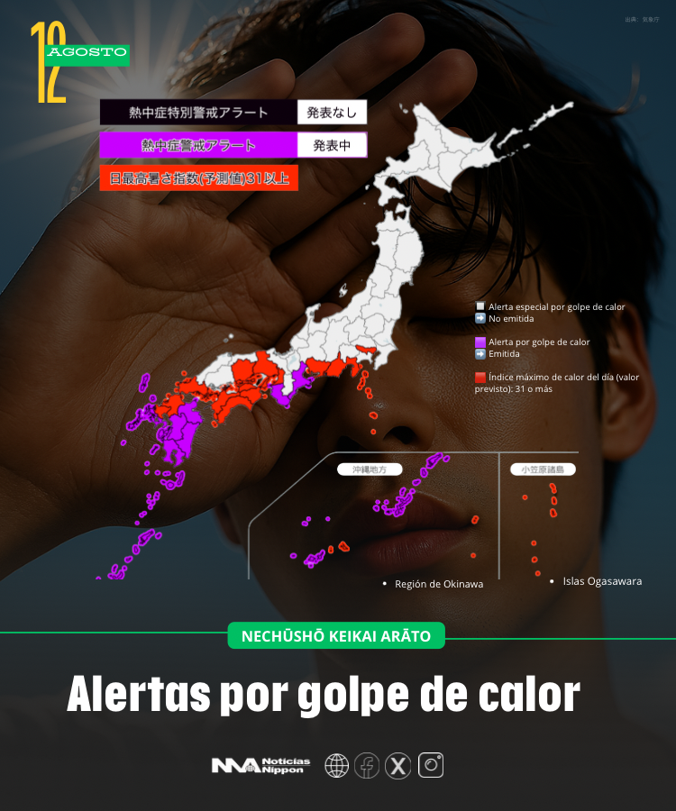 La Agencia Meteorológica de Japón (JMA) ha emitido la nechūshō keikai arāto, 熱中症警戒アラート (Alerta por Golpe de Calor) para este martes 12 de agosto de 2025 en amplias zonas del país.