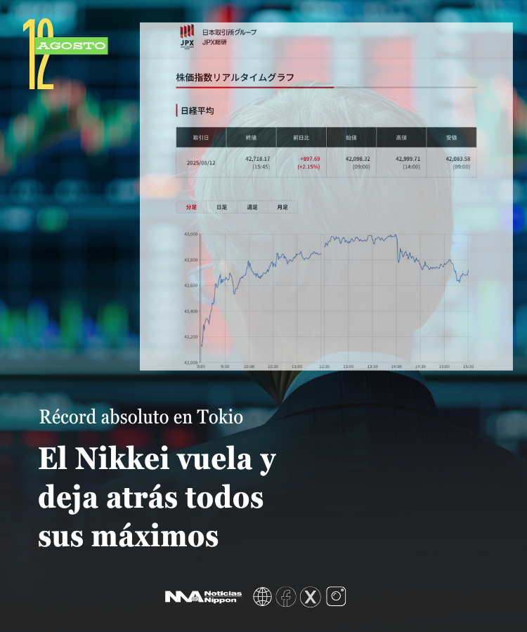 El índice Nikkei 225 no solo se disparó en las primeras operaciones, sino que rompió todos sus récords previos, cerrando en un nivel nunca antes visto: 42,718.17 puntos.