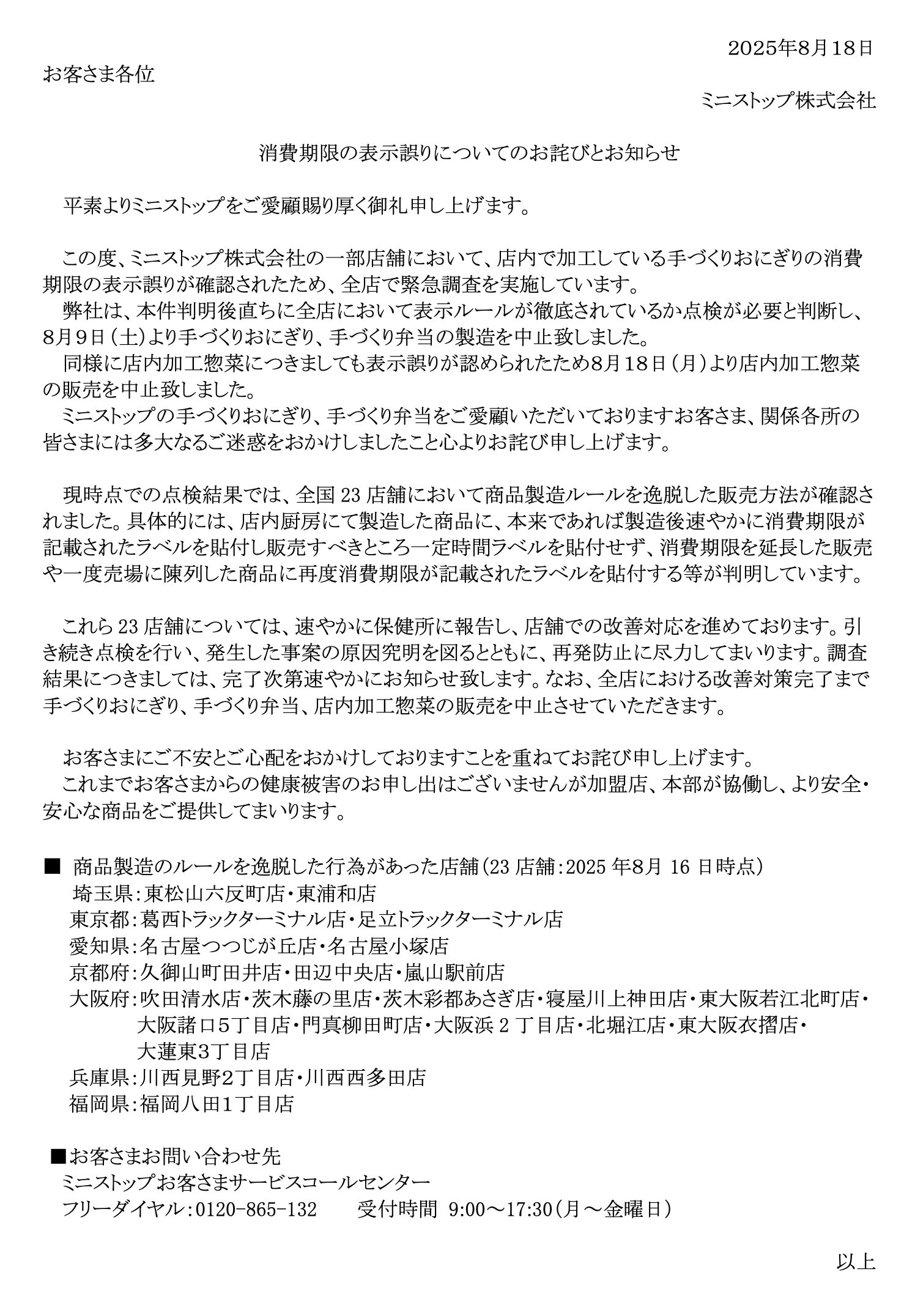 Al considerar necesario verificar el cumplimiento de las reglas de etiquetado en todo el país, desde el 9 de agosto (sábado) suspendimos la producción de onigiri y bentō elaborados en tienda. Asimismo, a partir del 18 de agosto (lunes), suspendimos la venta de platillos cocinados en nuestras cocinas internas cuando se constató también la alteración de etiquetas.