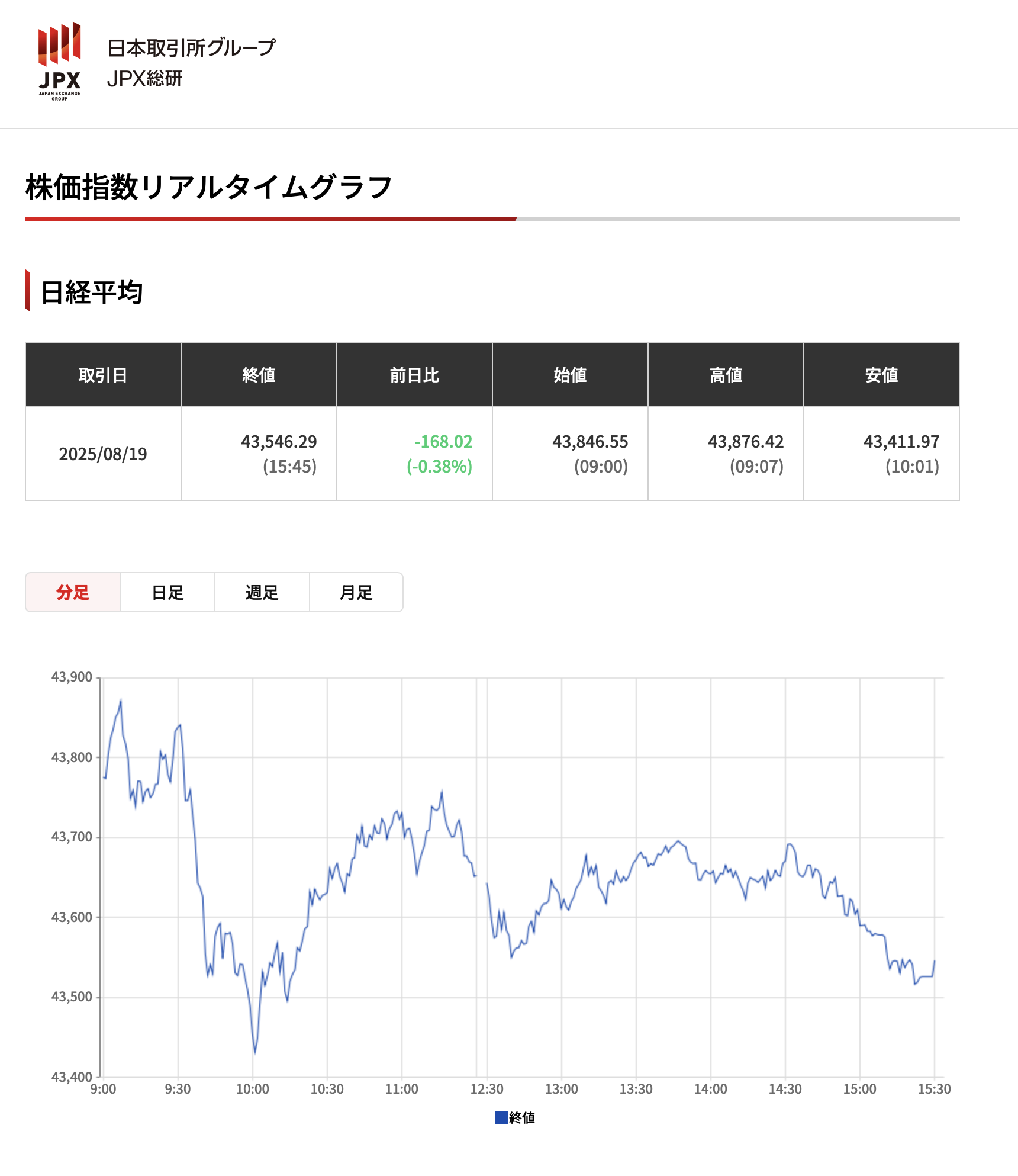 Cierre (15:45): 43,546.29 yenes → −168.02 yenes (−0.38%) respecto al día anterior.