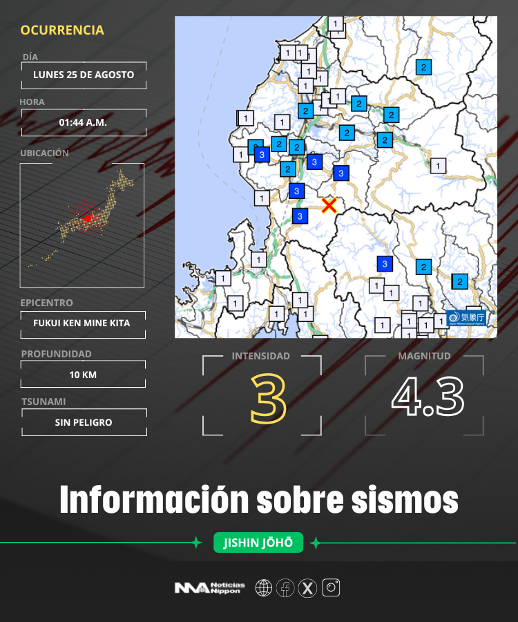 ✅ Conclusión: El sismo de Fukui (M4.3) fue moderado, ampliamente percibido y sin riesgo de tsunami. Se convirtió en un recordatorio silencioso, en medio de la madrugada, de que la prevención sigue siendo la mejor herramienta frente a la naturaleza.