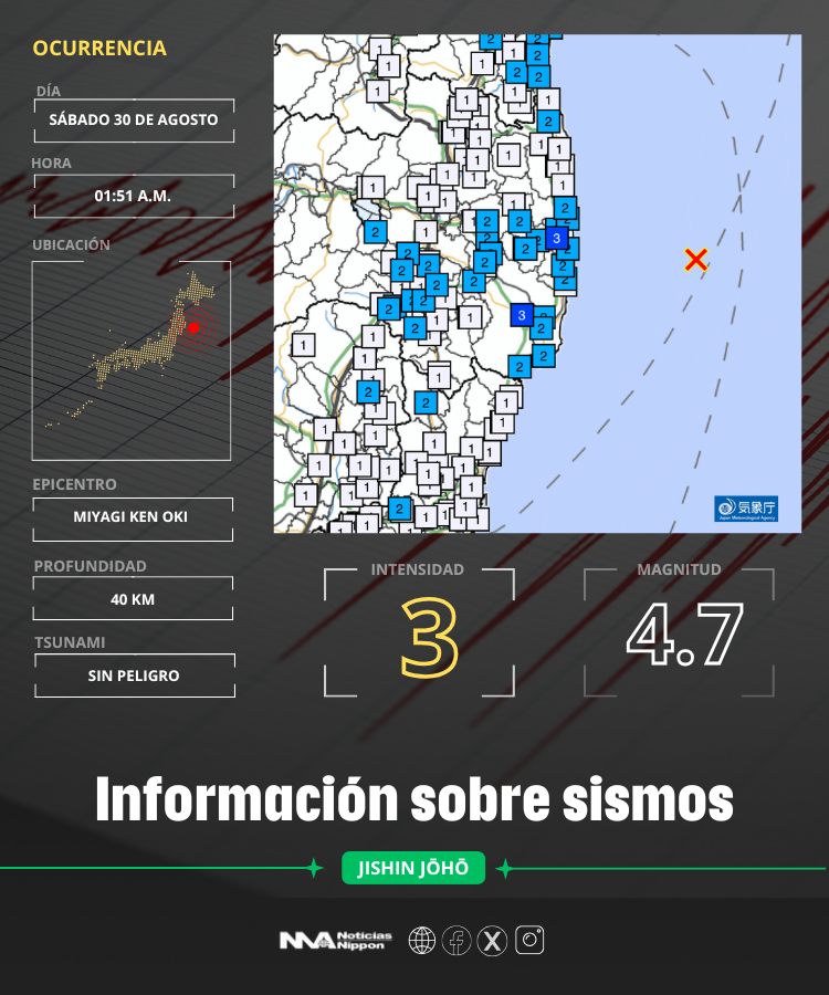 En la madrugada del 30 de agosto, a la 01:51, muchos habitantes de la región de Fukushima y alrededores fueron sorprendidos por un nuevo temblor moderado que sacudió casas y despertó a quienes dormían. El movimiento, de magnitud 4.7, tuvo su epicentro frente a la costa de Fukushima a unos 40 kilómetros de profundidad, según informó la Agencia Meteorológica de Japón.