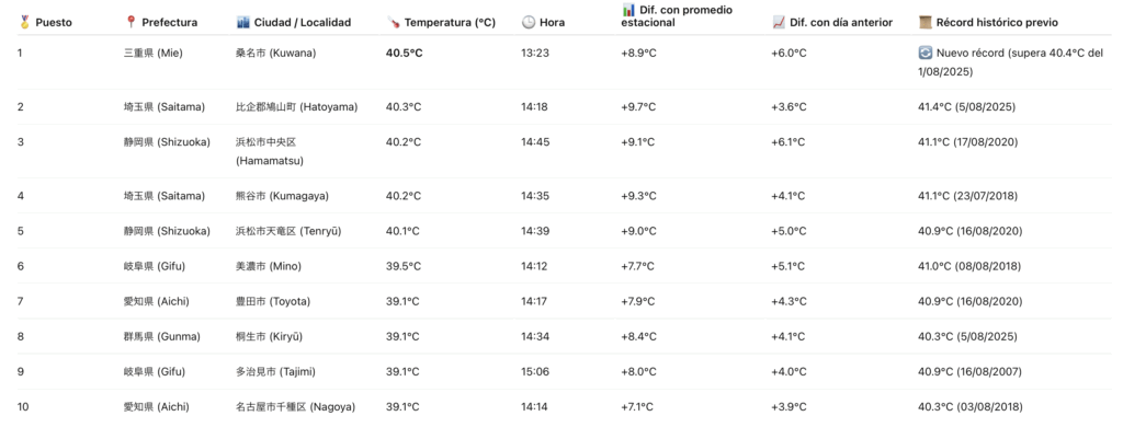 El verano de 2025 sigue marcando hitos extremos. la ciudad de Kuwana (Mie) alcanzó los 40.5°C, su récord histórico y la temperatura más alta del país en la jornada.