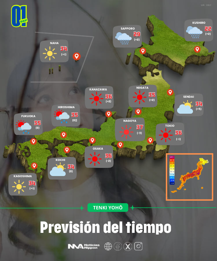 • Ciudades como Tokio, Osaka y Kanazawa llegarán a 36 °C, mientras que Nagoya marcará 37 °C (tras haber alcanzado 40 °C el día anterior).