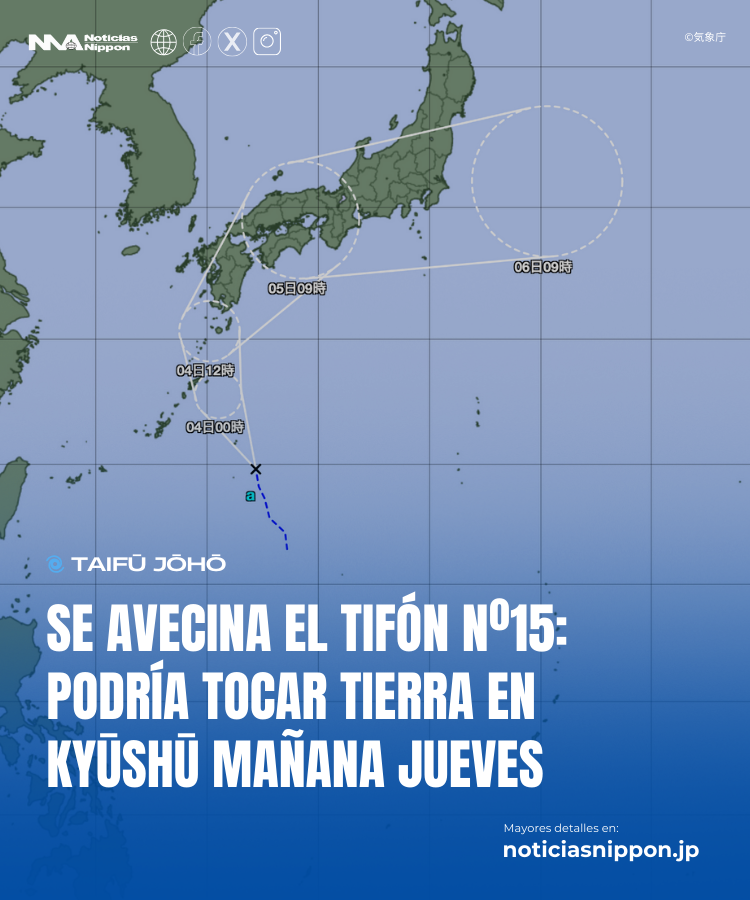 La trayectoria prevista apunta hacia Amami y Kyūshū, con un posible impacto a partir de mañana, jueves 4 de septiembre, y desplazamiento posterior hacia Tokai y Kantō el día viernes.