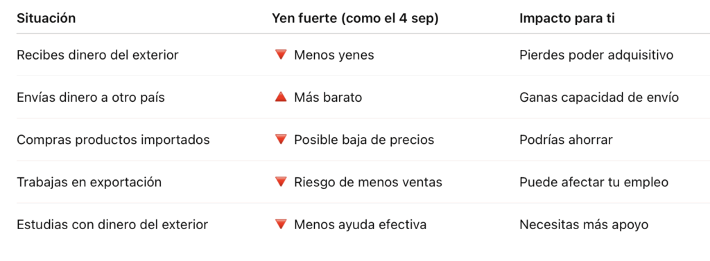 Buena noticia: el yen fuerte beneficia a quienes envían dinero al extranjero, porque necesitas menos yenes para comprar la misma cantidad de dólares o euros.