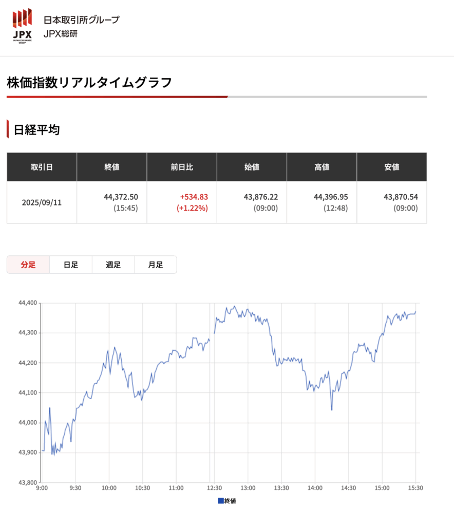 • Máximo intradía (高値): 44,396.95 (12:48)