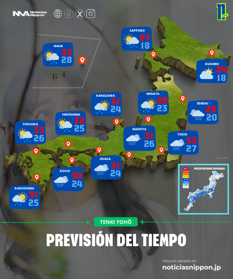- Desde Hokkaidō hasta Kyūshū y Okinawa, el ambiente es propenso a la formación de nubarrones y tormentas.