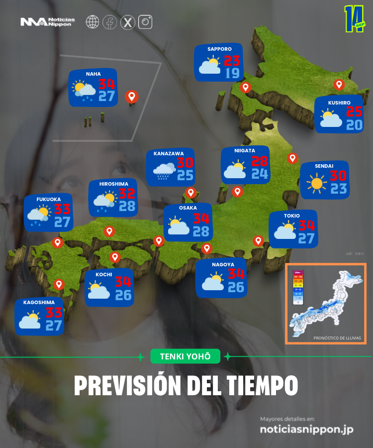 Hoy 14 de septiembre Japón enfrenta un día de lluvias peligrosas y atmósfera muy inestable, sobre todo en Hokkaidō, Hokuriku y Kyūshū norte. El mayor riesgo está en Yamaguchi, Fukuoka y Nagasaki, donde se podría formar un senjō kōsuitai durante la mañana. La clave es no confiarse, porque los cambios serán repentinos y el peligro de desastres naturales es alto.