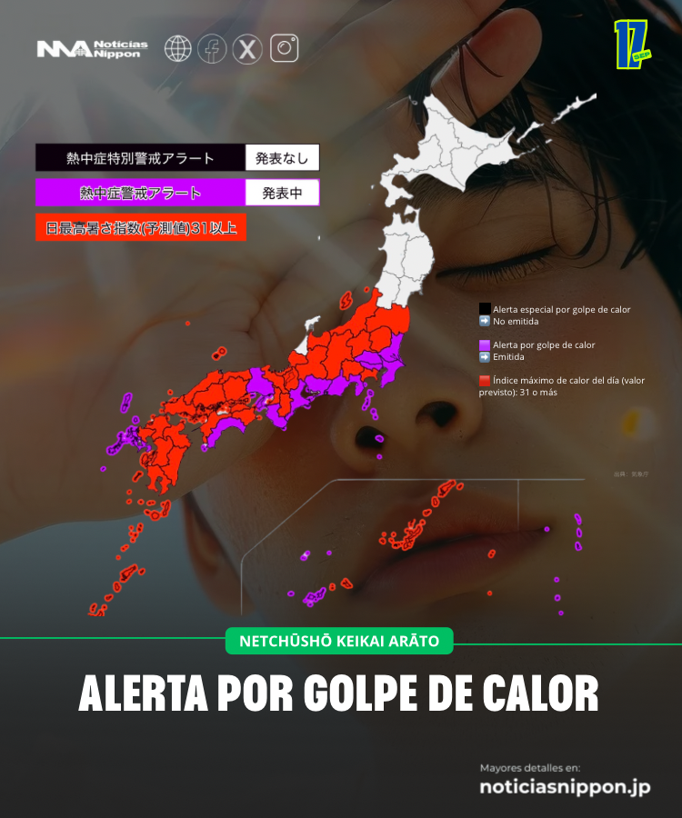 Hoy miércoles, la Agencia Meteorológica de Japón (気象庁, Kishōchō) y el Ministerio de Medio Ambiente (環境省, Kankyōshō) emitieron un alerta por golpe de calor (熱中症警戒アラート, Netchūshō Keikai Arāto) para 12 regiones que abarcan desde el área metropolitana de Tokio hasta el oeste del país.