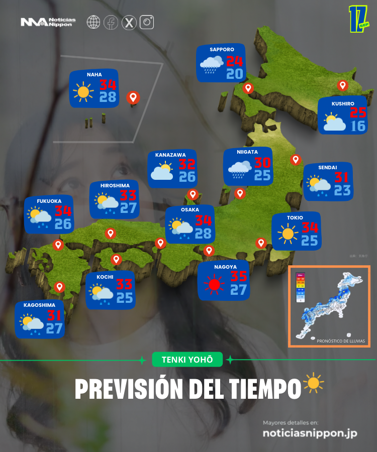 - Centro y sur: calor extremo, con alertas de golpe de calor vigentes en 12 prefecturas.