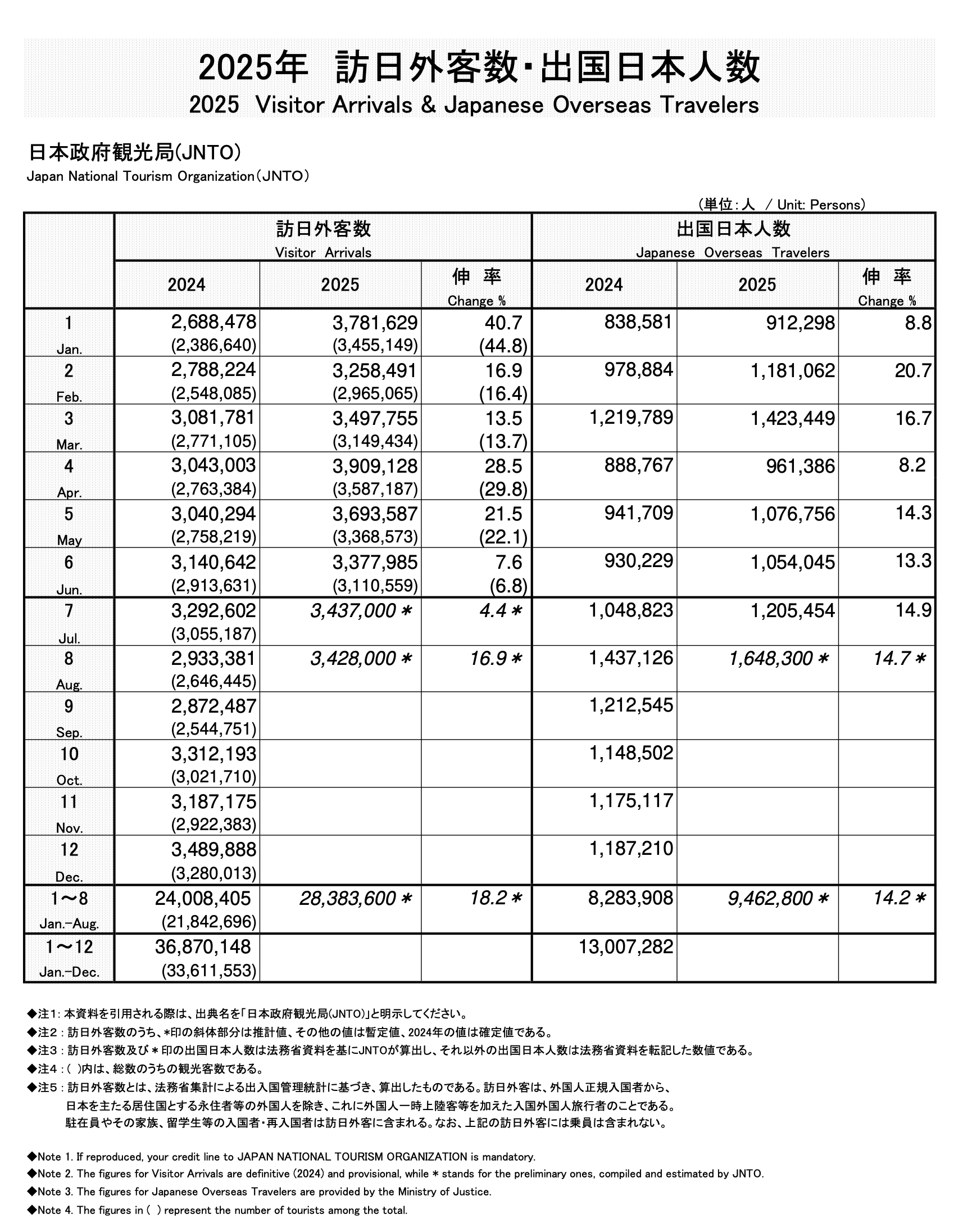En agosto de 2025, Japón recibió 3,428,000 visitantes extranjeros, un 16.9% más que el mismo mes del año pasado.