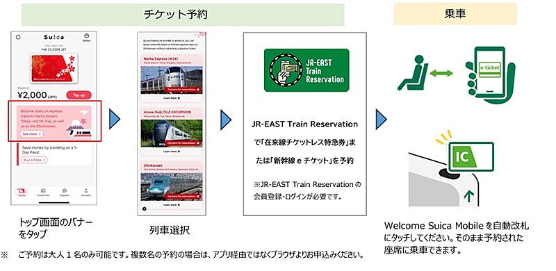 Los turistas podrán comprar y usar boletos de tren de manera totalmente digital a través de la aplicación Welcome Suica Mobile (que ya ofrece una tarjeta de transporte virtual para visitantes) se conectará directamente con JR-EAST Train Reservation, el sistema oficial de reserva de boletos de trenes y shinkansen.