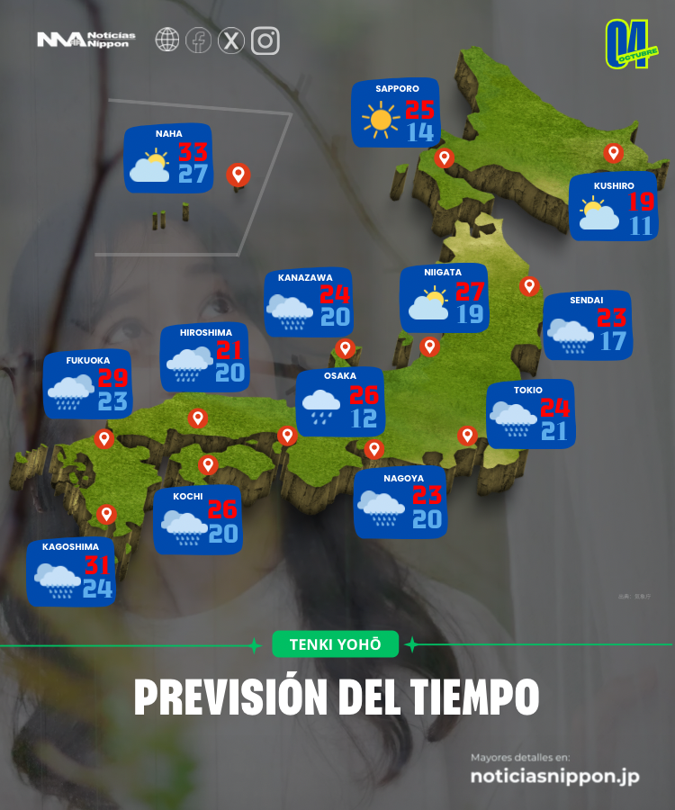 • Sapporo: 25°C / 14°C (tiempo soleado, 20%)