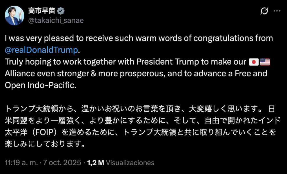 El expresidente estadounidense añadió además que “Japón ha elegido por primera vez a una mujer como primera ministra”, pese a que el proceso parlamentario de designación oficial del primer ministro —la votación en la Dieta— aún no se ha realizado.