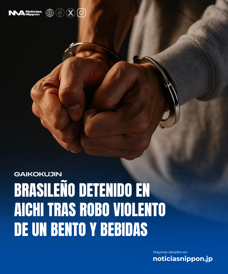 Un ciudadano brasileño de 20 años fue arrestado en flagrancia por robo violento (事後強盗, jigo-gōtō), tras sustraer productos de un supermercado y lesionar al guardia que intentó detenerlo.