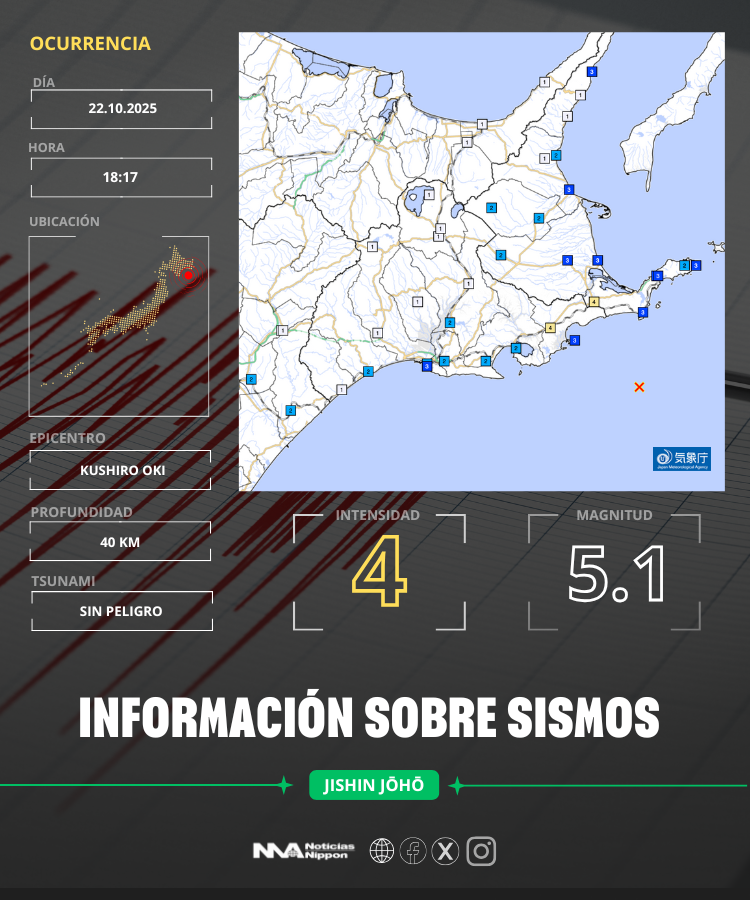 A las 18:17 horas del miércoles, un sismo de magnitud 5.1 sacudió el este de Hokkaidō, con epicentro en el mar frente a Kushiro, a una profundidad aproximada de 40 kilómetros, según informó la Agencia Meteorológica de Japón (気象庁).