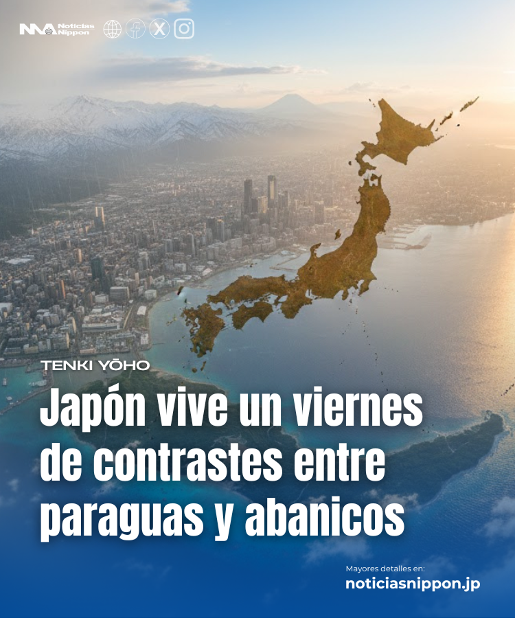 En el extremo opuesto, el frente estacional que persiste sobre las islas del suroeste mantiene la atmósfera cargada: Kyushu sur, Amami y Okinawa tendrán intervalos de chubascos y tormentas eléctricas. Se recomienda precaución ante rayos, ráfagas y lluvias repentinas.