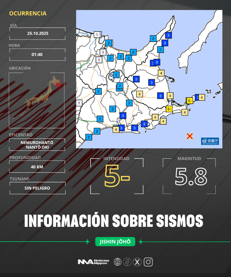 En la madrugada de este sábado, a las 1:40 a. m., un sismo de magnitud 5.9 remeció el extremo oriental de Hokkaidō, con epicentro en el mar al sureste de la península de Nemuro (latitud 42.9° N, longitud 145.6° E) y una profundidad estimada de 40 kilómetros, según informó la Agencia Meteorológica de Japón (気象庁).