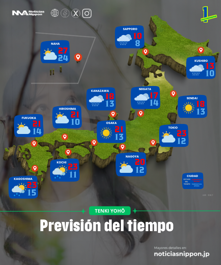 Tokio, Osaka y Nagoya presentan máximas entre 21 °C y 23 °C con nubosidad parcial y baja probabilidad de lluvia (20–40 %).