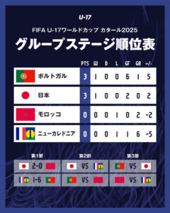 En la Copa Mundial Sub-17 de la FIFA Catar 2025, el Grupo de Japón comenzó con victorias para Japón y Portugal, que lideran la tabla con 3 puntos cada uno.