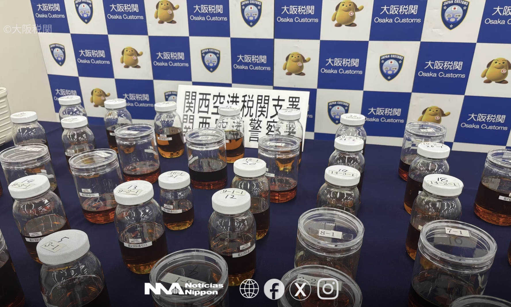 El hallazgo se produjo en el aeropuerto de Kansai, cuando un perro detector de narcóticos reaccionó ante una maleta con 37 envases —entre botellas de champú y frascos de alimentos— que contenían la sustancia. La droga, según las autoridades, provenía del aeropuerto Suvarnabhumi de Bangkok.