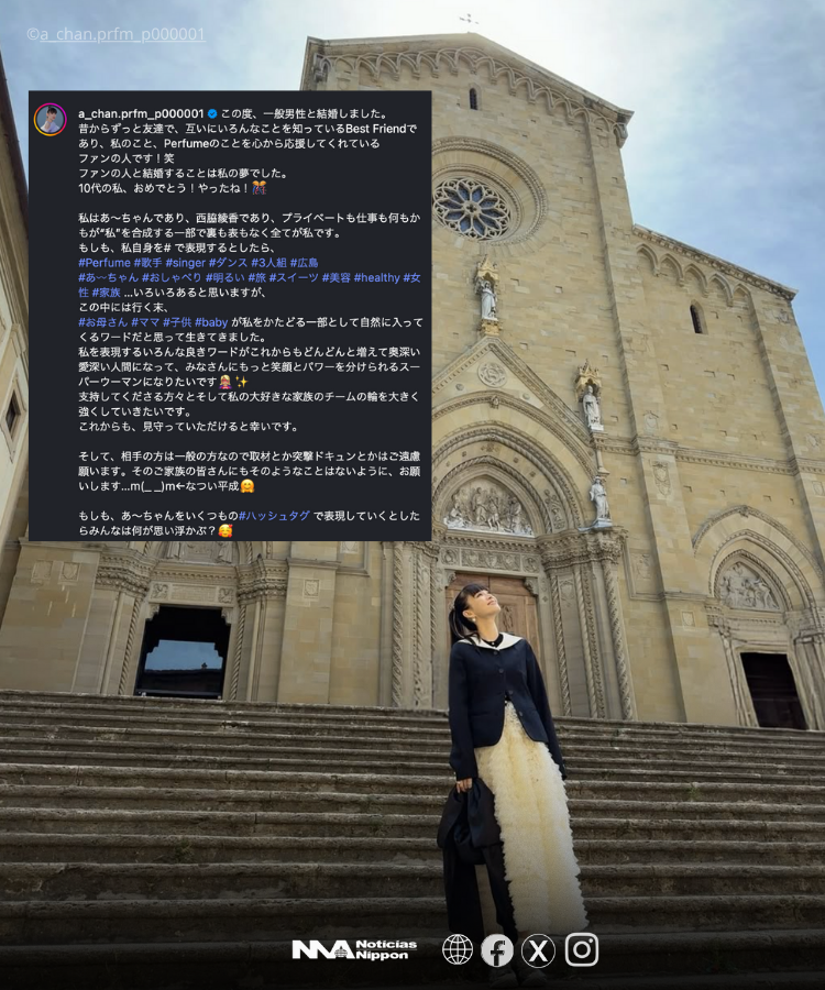 En un emotivo mensaje publicado el 11 de noviembre en su cuenta oficial de Instagram, Ayaka Nishiwaki, conocida como A~chan, integrante del icónico trío tecnopop Perfume, anunció su matrimonio con un hombre fuera del ámbito del espectáculo. La noticia llega apenas semanas después de que el grupo revelara que entrará en un periodo de “cold sleep” (pausa indefinida) antes de fin de año, lo que ha generado una oleada de nostalgia entre los fans.