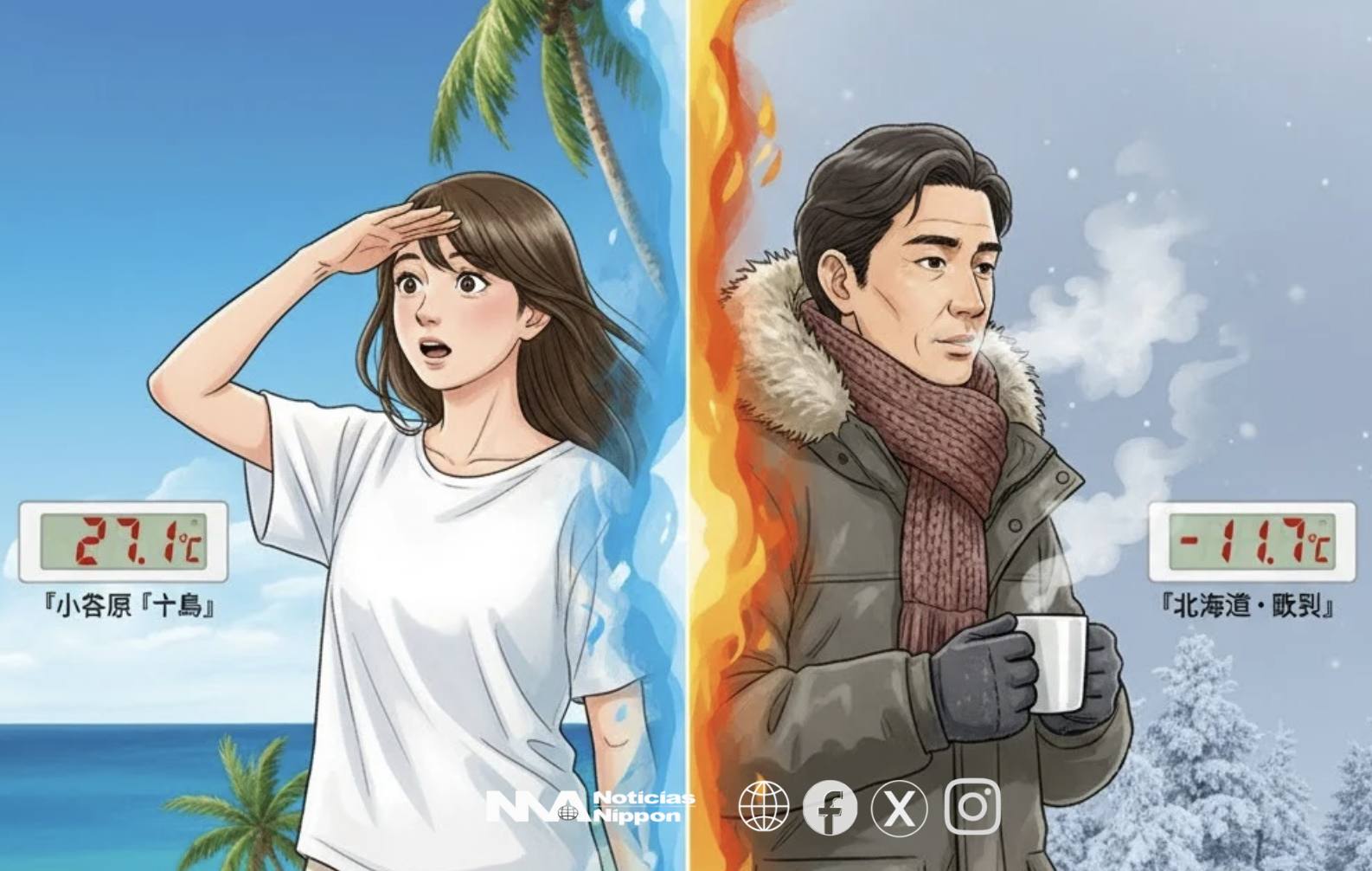 La diferencia térmica entre el cálido sur subtropical y el norte continental alcanzó hoy los 38.8°C, poniendo de relieve la complejidad climática del archipiélago japonés.