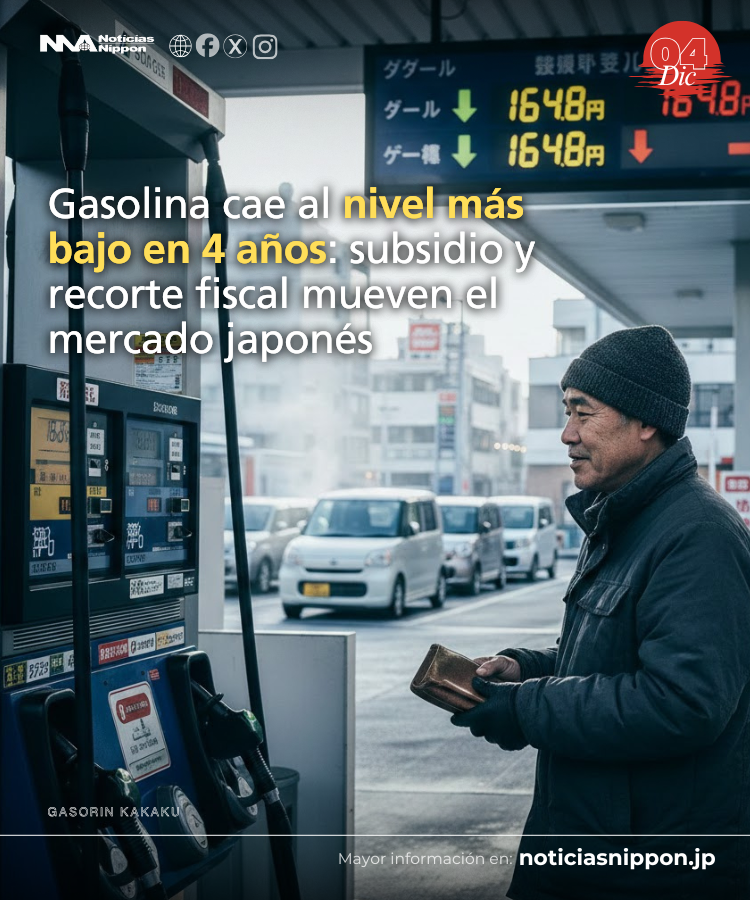 La reducción ocurre tras el aumento del subsidio gubernamental, que desde el 27 de noviembre pasó de 15 a 20 yenes por litro, en una maniobra diseñada para contener precios antes de la gran reforma fiscal prevista a finales de año.