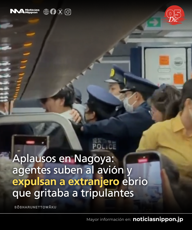 Ante la imposibilidad de continuar con el protocolo, la tripulación solicitó apoyo. Minutos después, cuatro a cinco agentes de la Policía Aeroportuaria de Nagoya subieron al avión, avanzando por el pasillo con calma profesional y determinación.