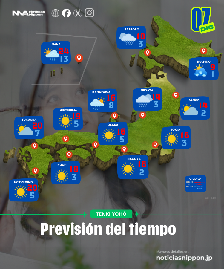 Japón amanece este domingo 7 de diciembre con un mapa meteorológico que parece dividido en dos mundos.