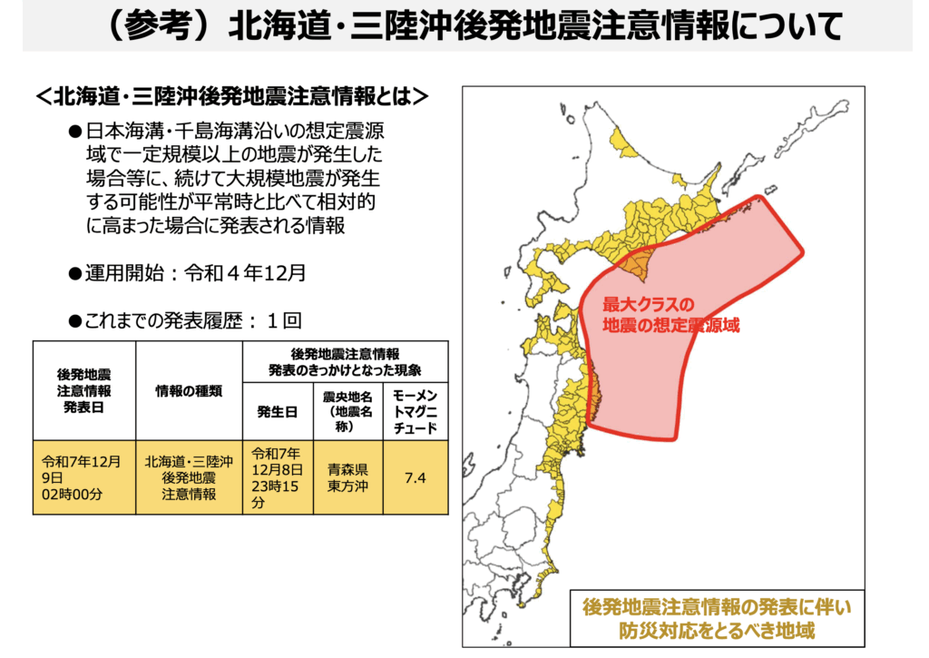 • Motivo: El terremoto de Mw 7.4 ocurrido el 8 de diciembre de 2025 a las 23:15 frente a la costa este de Aomori (青森県東方沖).