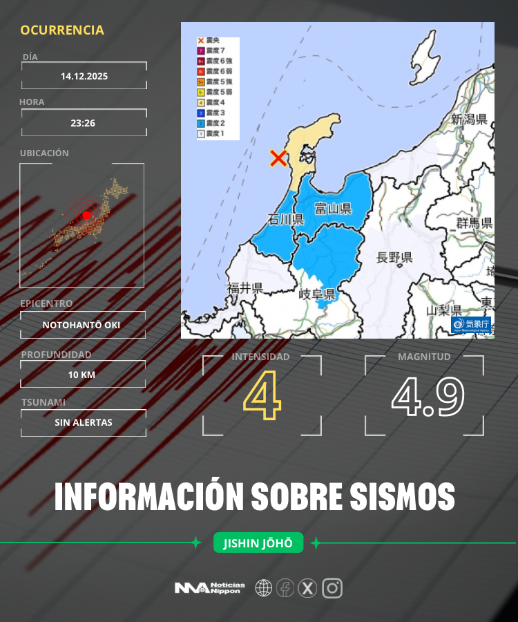 • Intensidades menores (2 y 1) se sintieron en prefecturas vecinas como Toyama, Gifu, Niigata, Fukui y Nagano.