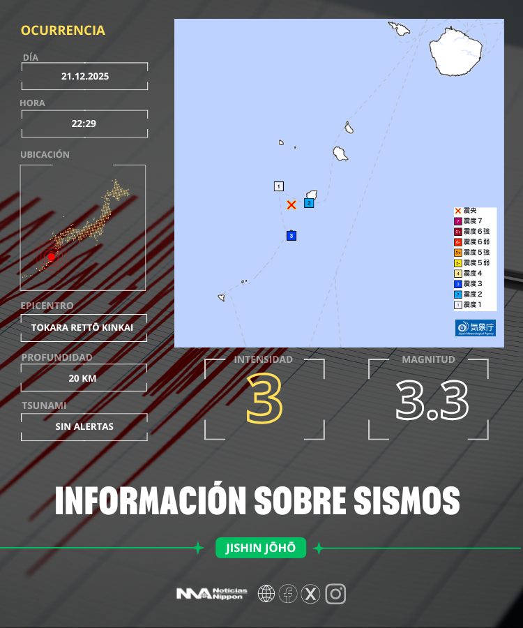 Una nueva sacudida proveniente de las profundidades del mar de Tokara recordó anoche a los habitantes de la Prefectura de Kagoshima la inestabilidad del cinturón de fuego. A las 22:03 horas, un movimiento telúrico de magnitud 3.3 golpeó el archipiélago sur, alcanzando una intensidad máxima de Shindo 3 en la escala japonesa.