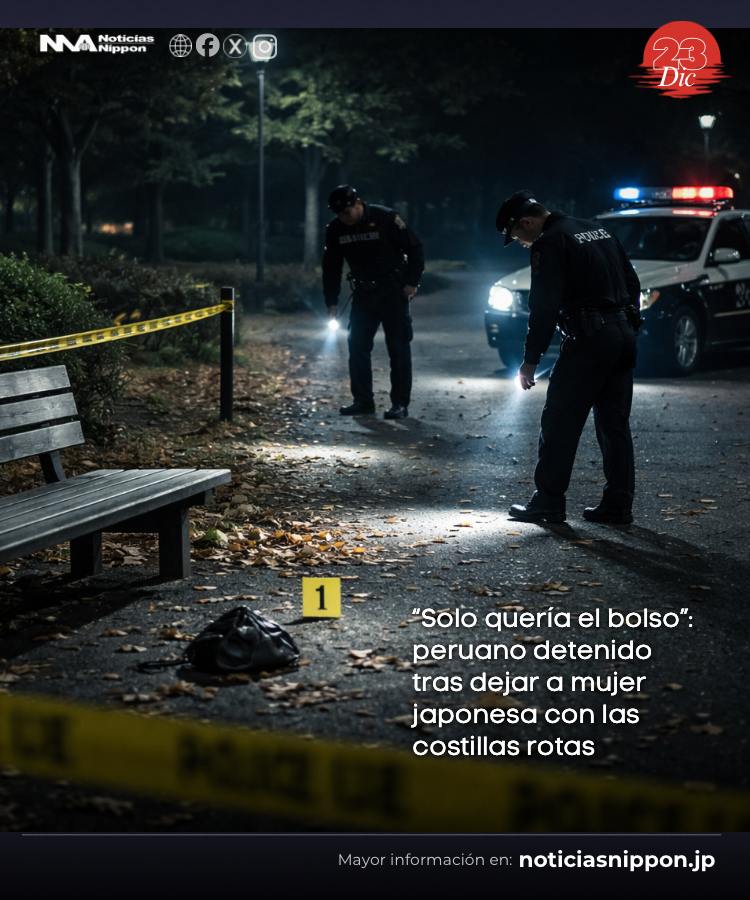 Un parque tranquilo de Kōsai se convirtió en escenario de un violento asalto que dejó a una mujer de unos 50 años gravemente herida. Sentada en un banco, la víctima fue abordada por un hombre que le arrebató el bolso; durante el forcejeo cayó al suelo y sufrió fracturas en las costillas, lesiones que la policía calificó como graves.