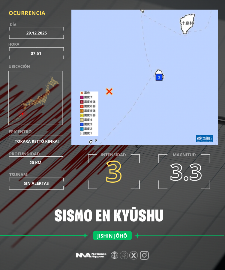 La Agencia Meteorológica de Japón (JMA) informó que a las 07:51 de la mañana se registró un sismo de magnitud 3.3 con epicentro frente a las islas Tokara a una profundidad aproximada de 20 km.