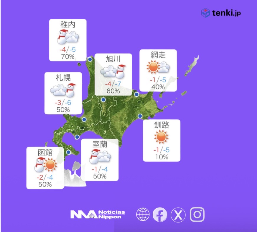 • 稚内 (Wakkanai): 🌨 Nieve y nubes | Máx -4°C / Mín -5°C | 🌧 70%